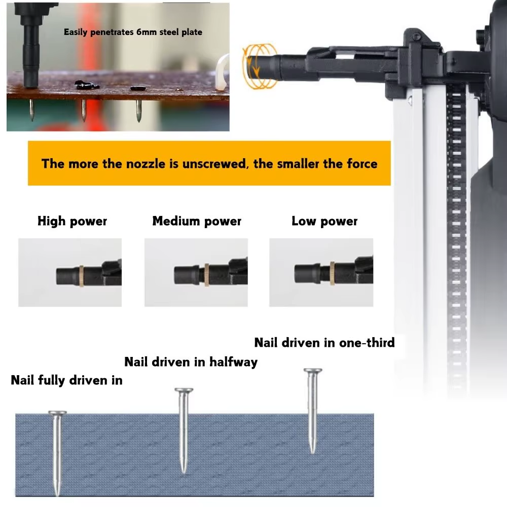 - Adjustable Power: Rotating nozzle to control nail depth (fully, half, one-third)