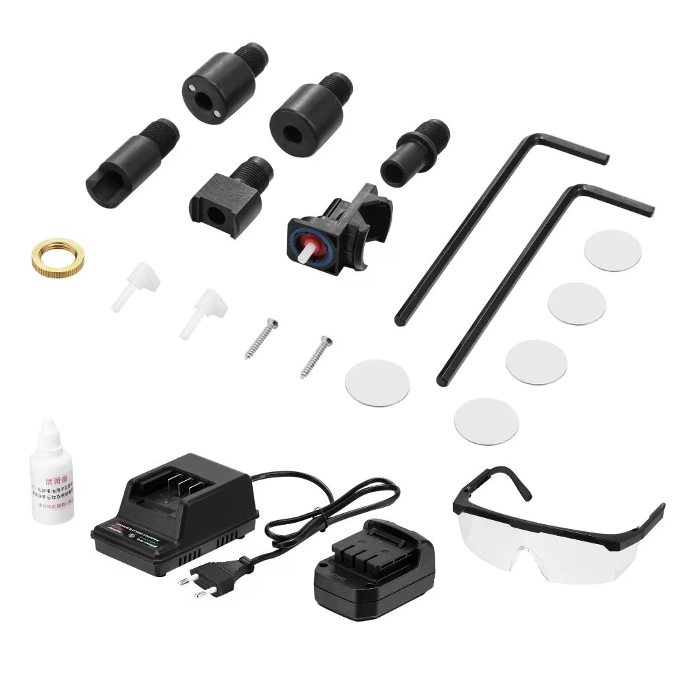 - Accessories: Lubricating oil, adjustment ring, safety goggles, accessory pack, wo battery, charger