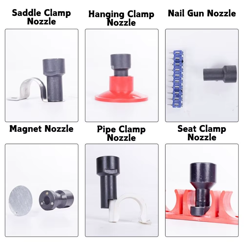 - Nozzle Types: Saddle clip nozzle, hanger clip nozzle, conduit clip nozzle, magnet nozzle, saddle staple nozzle, nail nozzle